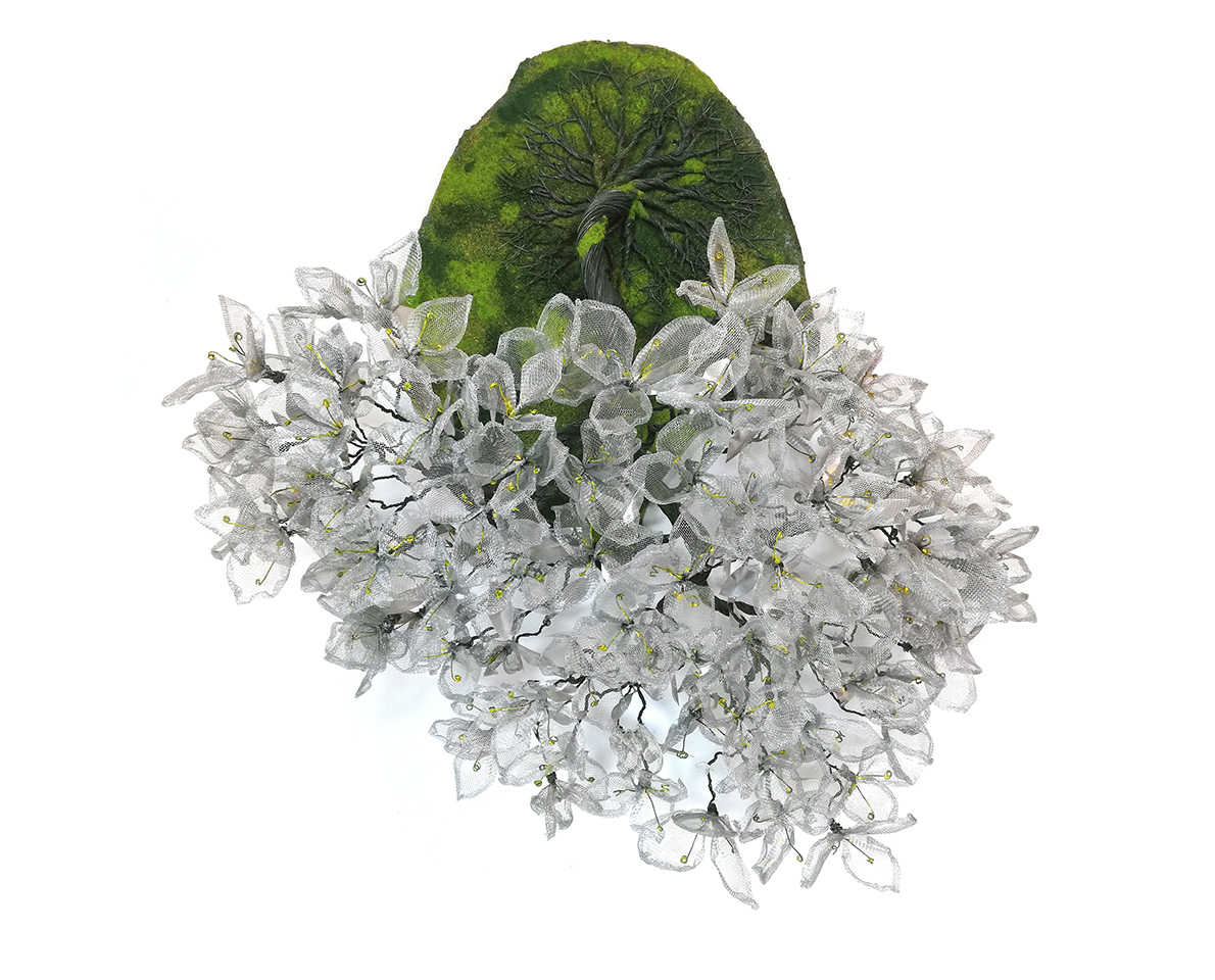 Materials: Wood, colored grass Noch, oxidized wire, aluminum sheets, aluminum mesh and metallic paint.
