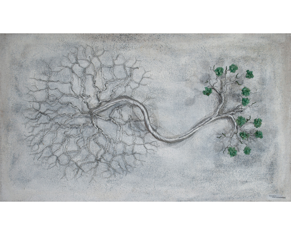 Materials: Galvanized wire, semi-precious stones, sand, acrylic.