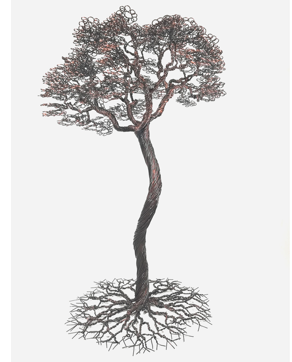 Tree made of black building wire with spiral foliage 38 cm in diameter and copper colored metallic accents.