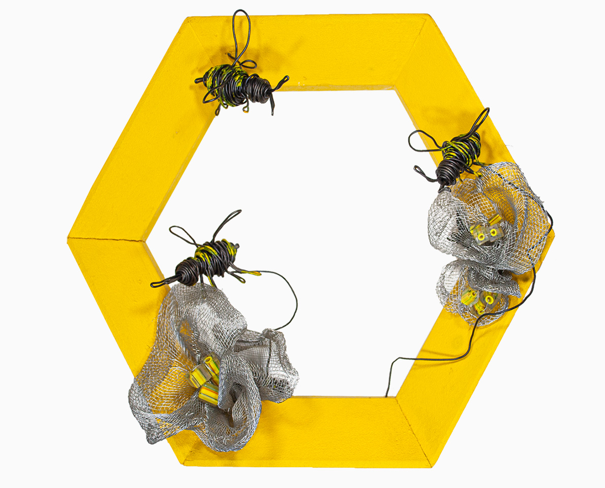 Three-dimensional wall-mounted composition of construction wire fine aluminum mesh, decorative elements of Murano glass beads, fitted on a hexagonal wood frame.